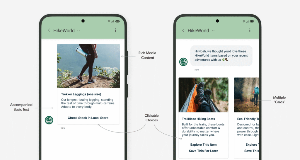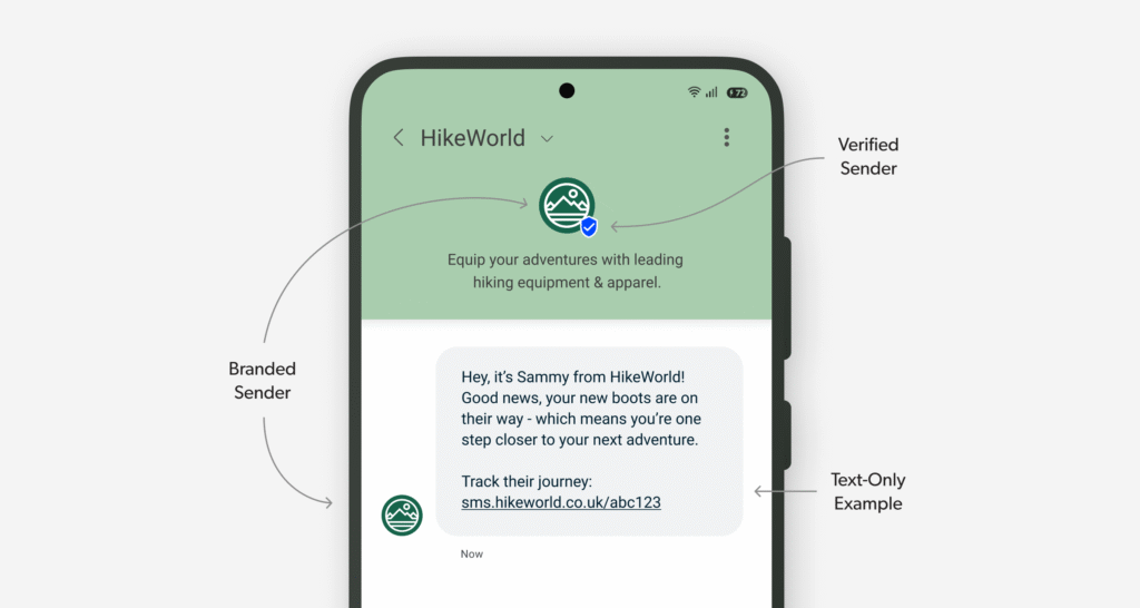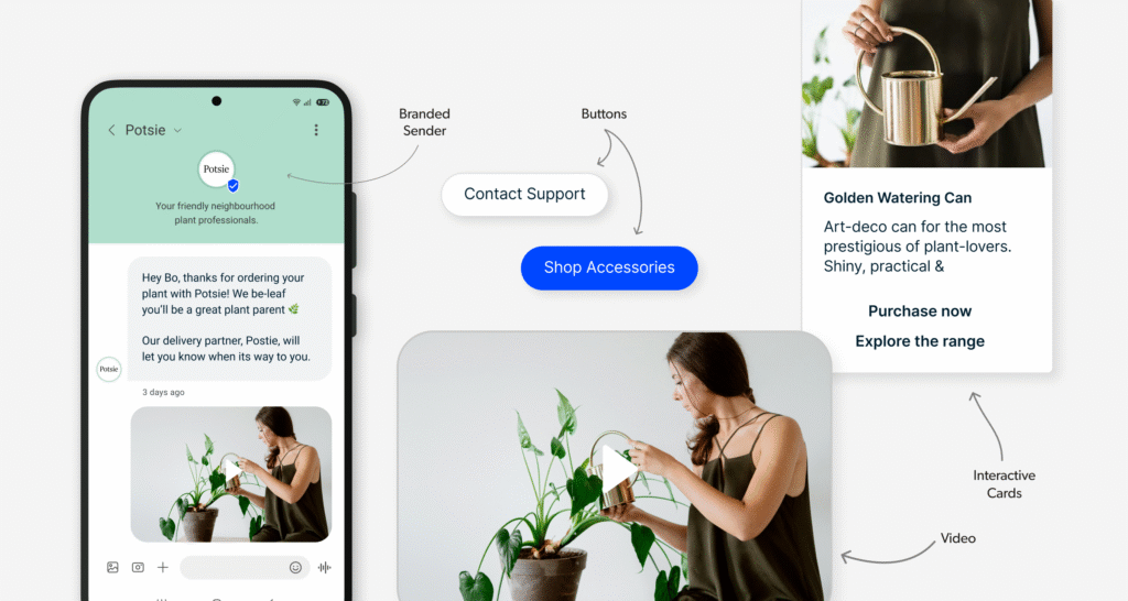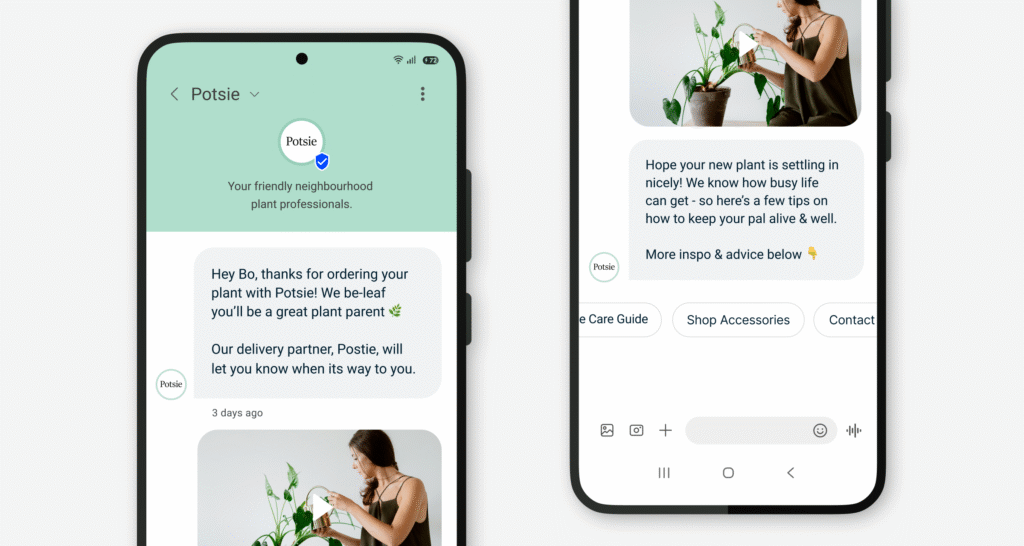 RCS simply adds a layer of branding and interaction on top of those trusty foundations. Your messages can feature your business’s verified logo, name, and even brand colours to build instant trust and recognition.